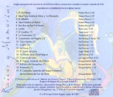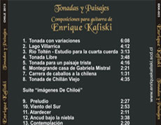 El músico chileno, intérprete y arreglador Enrique Kaliski, ofrece en la presente publicación, su faceta de compositor-cultor de las propias raíces, recreando ancestrales giros melódicos, secuencias armónicas y patrones rítmicos de la música del Chile Norte, Centro, Sur e Insular, los que entretejidos con recursos sonoros idiomáticos de la guitarra, conducen a un viaje cargado de reminiscencias.”